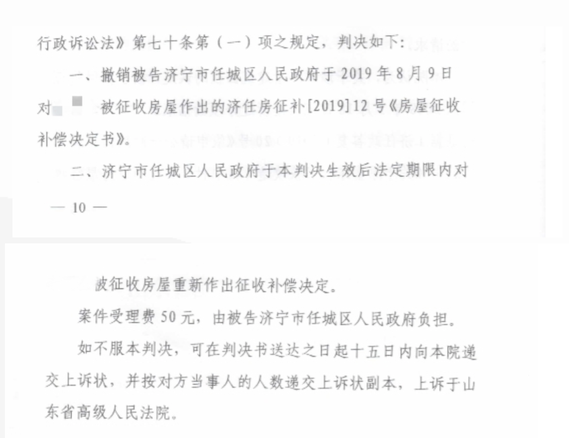 经过圣运律师前期的努力及后期开庭的表现,法院在查明了案件详情后,判决撤销了济宁市任城区人民政府作出的《房屋征收补偿决定书》,区人民政府于判决生效后在法定期限内对曹先生的被征收房屋重新作出征收补偿决定。