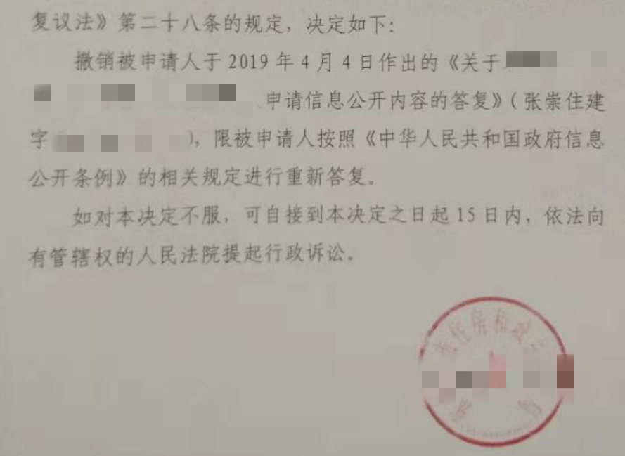 复议机关经查明案情后,认可了圣运律师的意见,撤销了张家口市崇礼区住房和城乡建设局于2019年4月4日作出的信息公开答复,并限其按照《中华人民共和国政府信息公开条例》的相关规定进行重新答复。