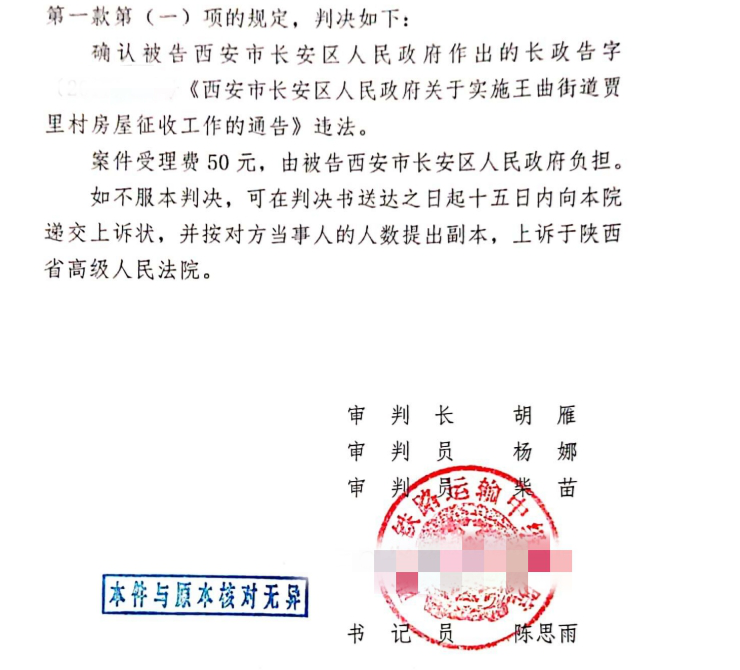 法院经查明案情后,认可了圣运律师的意见,确认西安市长安区人民政府作出的《西安市长安区人民政府关于实施王曲街道贾里村房屋征收工作的通告》违法。