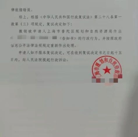 复议机关经查明案情后,认可了圣运律师的意见,撤销了上海市普陀区规划和自然资源局作出《告知书》的行政行为,并按照政府信息公开法律法规重新作出处理。