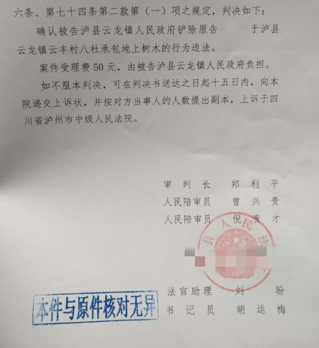 法院经查明案情后,认可了圣运律师的意见,确认泸县云龙镇人民政府铲除杨先生位于泸县云龙镇云丰村八社承包地上树木的行为违法。