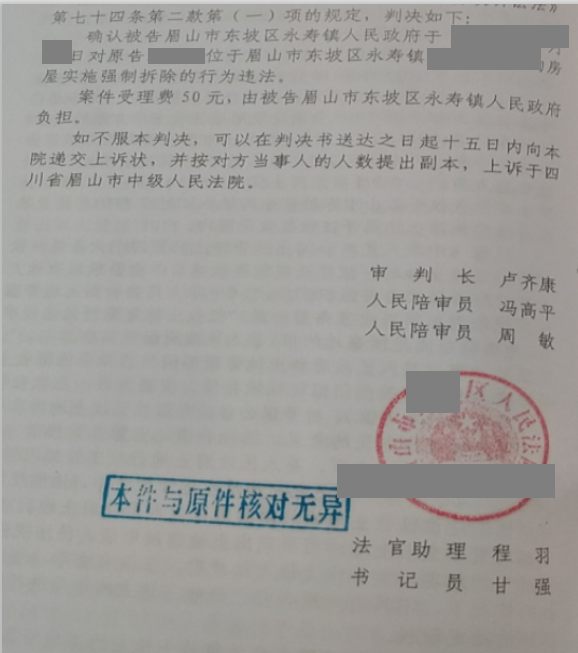 法院经审理后,认可了圣运律师的意见,确认了眉山市东坡区永寿镇人民政府对周先生的房屋实施强制拆除的行为违法。