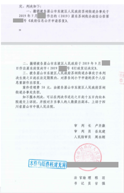 法院经审理采纳了圣运律师的意见,判决撤销了眉山市东坡区人民政府苏祠街道办事处作出的《政府信息公开申请答复》及眉山市东坡区人民政府作出的《行政复议决定》,并判决眉山市东坡区人民政府苏祠街道办事处于判决生效之日起在法定期限内对李先生申请的个人信息进行重新答复。这份胜诉判决也为李先生等百余户居民之后的维权道路奠定了良好的基础。