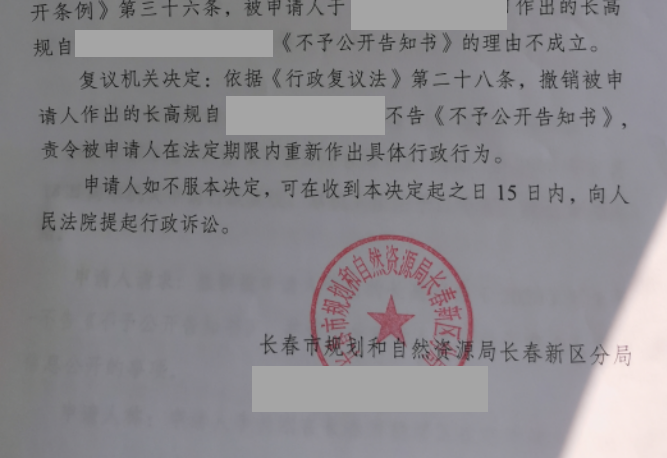 复议机关经审理后,也认可了圣运律师的意见,撤销了长春市高新技术产业开发区建设管理局(原长春市高新技术产业开发区规划和国土资源局)作出的《不予公开告知书》,并责令其在法定期限内重新作出具体行政行为。