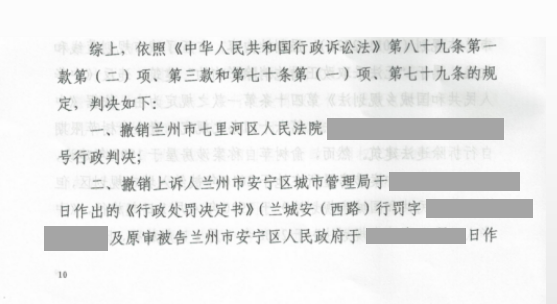 经过充分的准备和努力,二审法院认可了圣运律师的意见,判决撤销了一审法院的判决以及兰州市安宁区城市管理局作出的《行政处罚决定书》和安宁区人民政府作出的《行政复议决定书》。这样的二审胜诉结果推进了张女士的维权进程,也相信在律师的协助下,张女士会更好的维护自己的合法权益,得到合理的补偿。