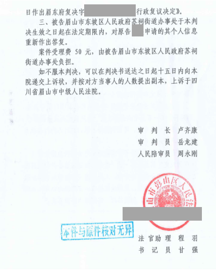 法院经审理采纳了圣运律师的意见,判决撤销了眉山市东坡区人民政府苏祠街道办事处作出的《政府信息公开申请答复》及眉山市东坡区人民政府作出的《行政复议决定》,并判决眉山市东坡区人民政府苏祠街道办事处于判决生效之日起在法定期限内对廖女士申请的个人信息进行重新答复。这份胜诉判决也为廖女士等百余户居民之后的维权道路奠定了良好的基础。