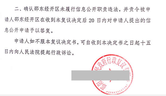 复议机关经审理后,认可圣运律师的意见,确认邵东市区管委会未履行信息公开职责违法,责令其在收到复议决定之日起20日内对于先生提出的信息公开申请予以答复。