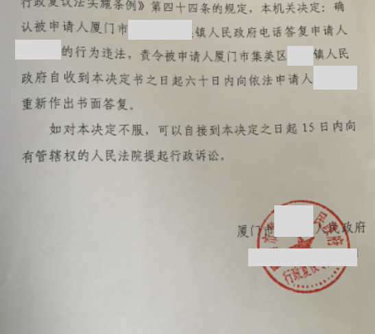 复议机关经审理后,认可圣运律师的意见,确认了厦门市某镇政府电话答复孙先生的行为违法,责令镇政府自收到决定书之日起六十日内依法向孙先生重新作出书面答复。该结果奠定了孙先生下阶段维权进程的基础,期望圣运律师能协助孙先生尽快取得维权成功。