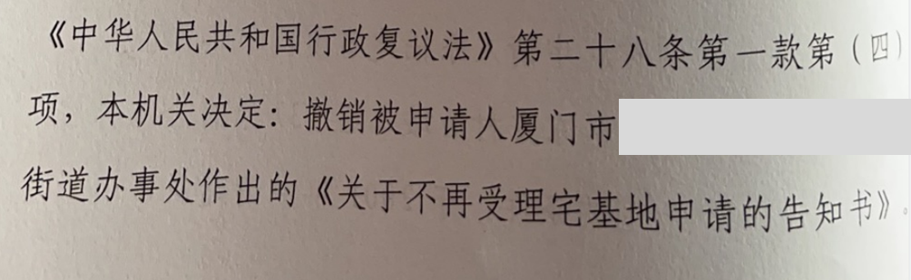 复议机关经审理后,认可圣运律师的意见,撤销了厦门市区政府街道办作出的《关于不再受理宅基地申请的告知书》。同时,责令街道办依法重新作出处理。该结果奠定了吴先生成功申请宅基地奠定了基础,期望圣运律师能协助吴先生尽快取得维权成功。