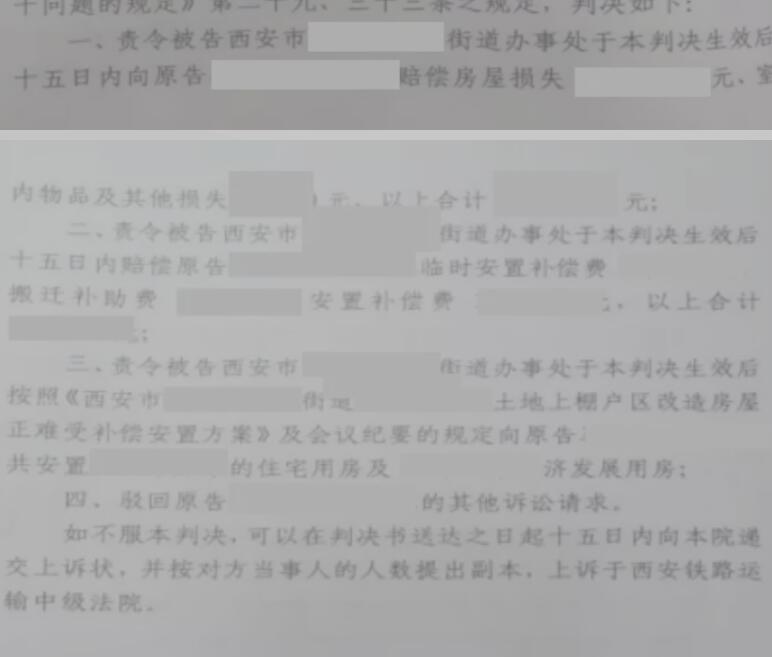 法院经审理后,认可圣运律师的意见,判决西安市某区街道办事处在判决生效后向曲女士等人等人的房屋损失进行赔偿,并支付临时安置补偿费用、搬迁补助费、安置补偿费,并责令街道办向曲女士等人等人安置相应的经济发展用房。在律师的协助下,曲女士等人的合法权益初步得以维护。