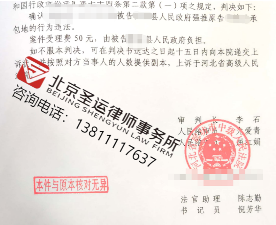 法院经审理后,认可圣运律师的意见,判决确认县政府强推邢先生承包地的行为违法。