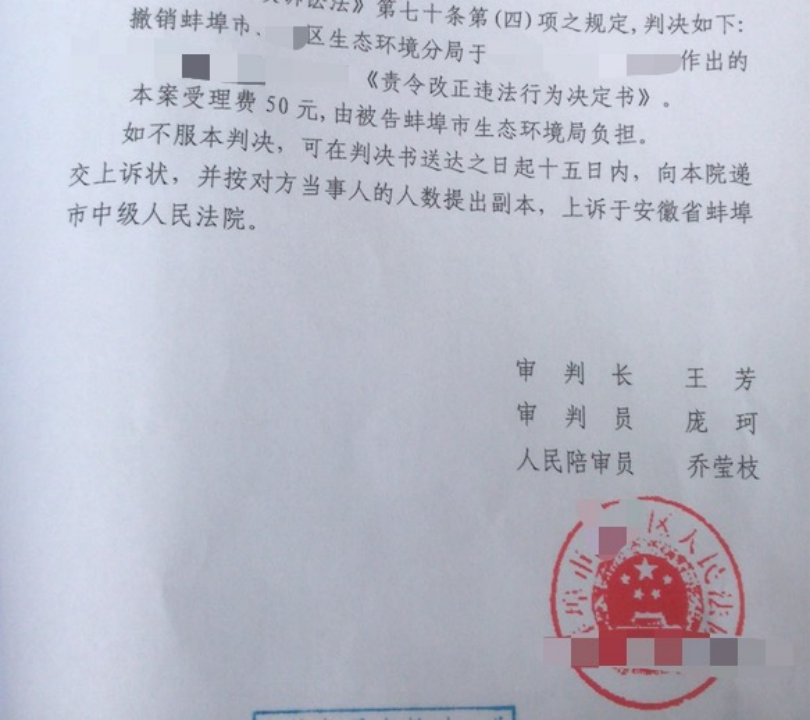 法院经审理后,认可圣运律师的意见,判决撤销了蚌埠市某区生态环境分局作出的《责令改正违法行为决定书》。