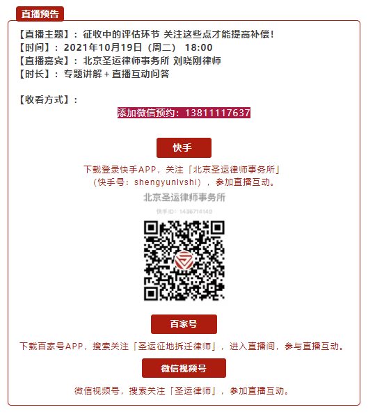 对此,2021年10月19日星期二18:00的直播中北京圣运律师事务所刘晓刚律师将为大家进行直播解答帮助大家了解相关规定,助力进行有效维权。本文中,圣运律师将为大家带来相关高院案例的普法解读,拆迁户朋友们可以进行相关了解,转发收藏!