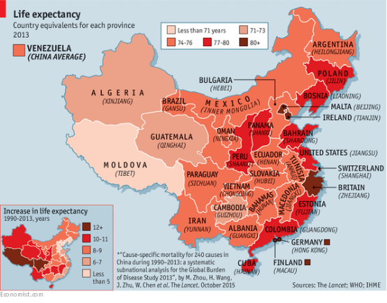 该研究表明,在中国,一个1990年出生的婴儿预期寿命是68岁,2013年出生的婴儿将达到76岁,超过孔子所说的"从心所欲不逾矩"的年龄——70岁。各省的情况差异悬殊,但差距正在缩小。在上海,当前的预期寿命是83岁——和瑞士一样高。其中有6个地区的居民活得比美国人长。最引人瞩目的进步出现在一个最落后的地区:在细则,一个1990年出生的婴儿的预期寿命是56岁,接近于一个极贫穷的非洲国家。但这一数据现今上升为70岁,接近于欧洲一个贫穷国家摩尔多瓦的水平。