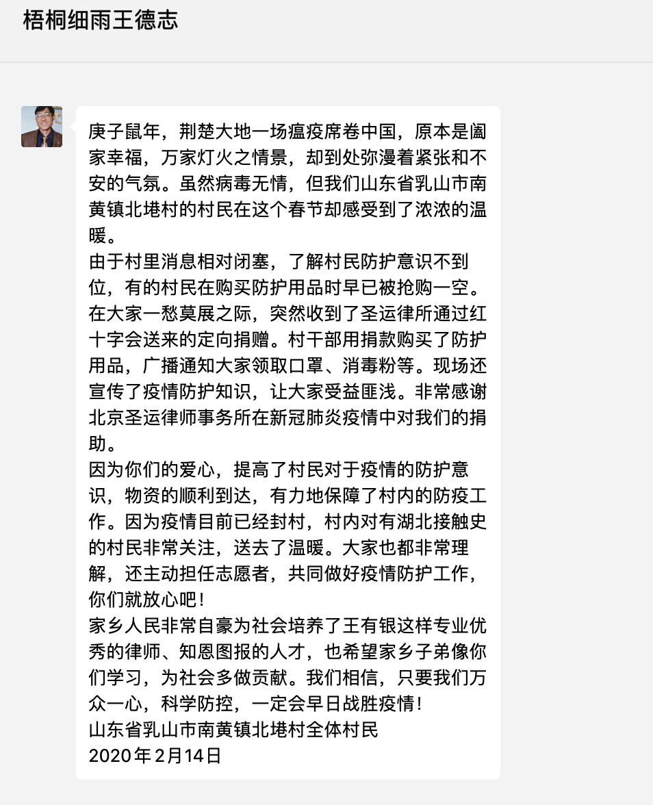 得知家乡父老同心战疫、共克时艰、科学防护、身体平安,圣运律所非常欣慰。为此,特地给村民们发送了微信!希望村民们科学防疫、保重身体。