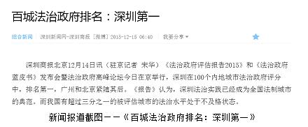新闻报道截图——《百城法治政府排名:深圳第一》