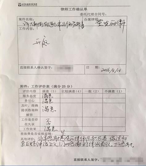 在此案件结束后,律所收到了二位当事人书写的《律师工作确认单》,办理此案例的律师得到了当事人的认可和极高的评价,并感谢律师尽职尽责,依法为百姓伸张正义,同时也通过短信等方式进行了感谢。 此次代理中,王有银主任及其团队律师黄晓丽付出了很大的努力,结合具体案情,为二位当事人制定了一个全面的维权计划,力图为其提供有效的法律救济,保护好二位当事人的合法权益。虽然一审我方败诉,但是二位律师建议通过上诉的方式来获得一个公正、合理的判决结果。在经二审审理后,二审法官支持了黄晓丽律师的主张,维护了当事人的合法权益,得到了合理的判决结果,帮助当事人伸张了正义。