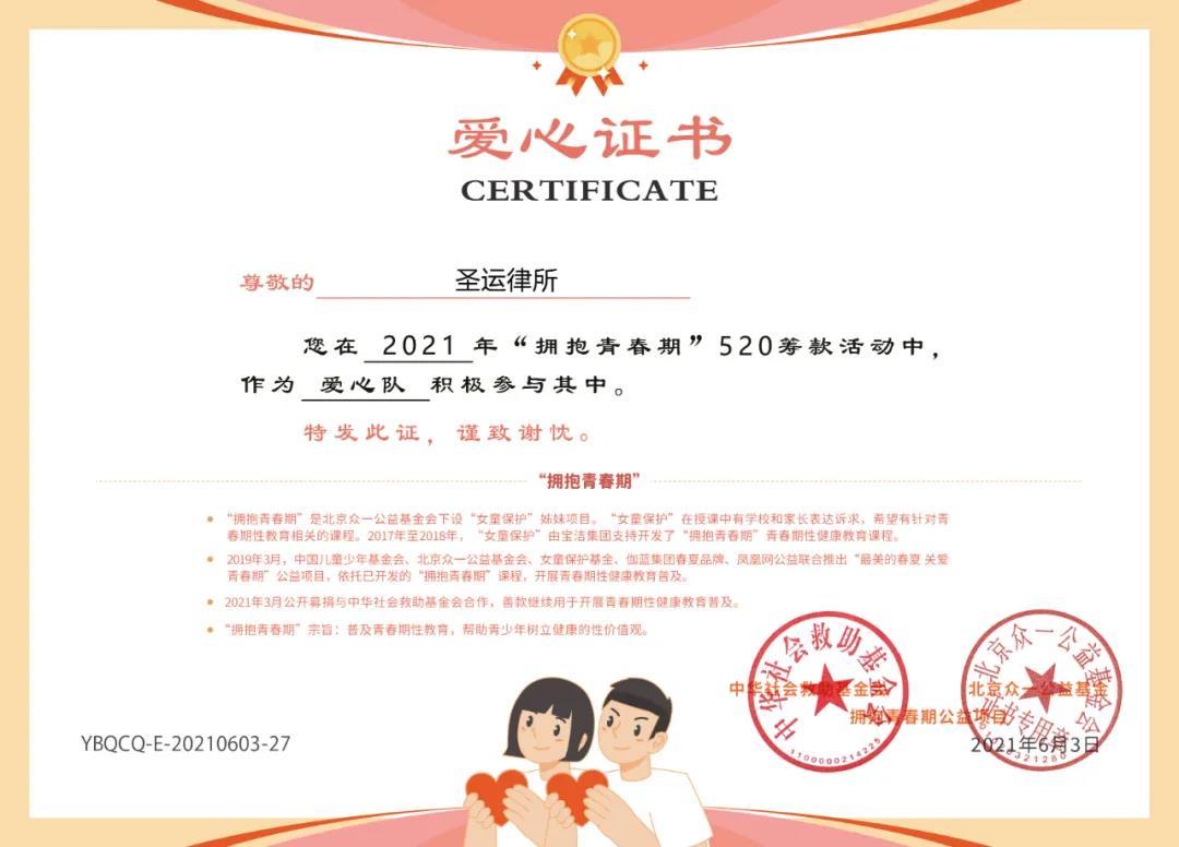 图:圣运律所获得女童保护组织颁发的《爱心证书》
