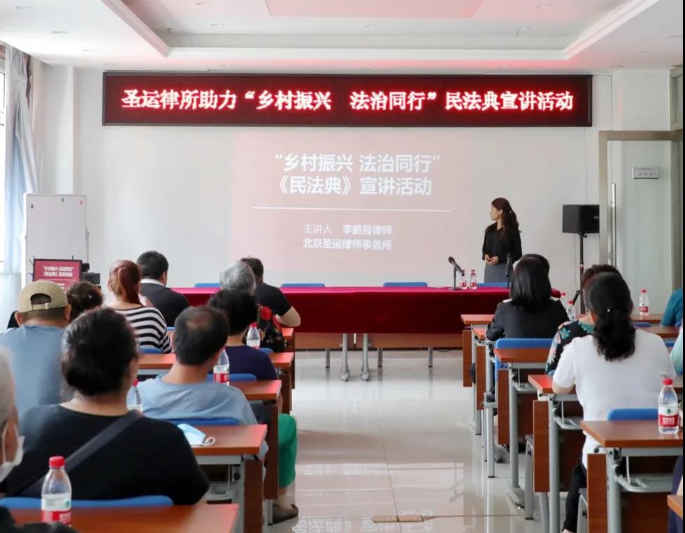 为深入贯彻落实党中央、国务院关于实施乡村振兴战略的决策部署,并倾力投入到司法部开展的"乡村振兴 法治同行"活动之中。圣运律所公益法律部特组织圣运律师团队开展《民法典》宣讲公益活动。通过公益普法宣讲、为村民答疑以及为乡村企业进行"法治体检"三种形式,为村民提供了多元化的专业法律学习"快车道",明确了在乡村振兴工作中,法律法规知识的重要性。未来,圣运律所将长期树立首都律师的责任感意识,继续践行律师普法使命,承担更多的社会责任。