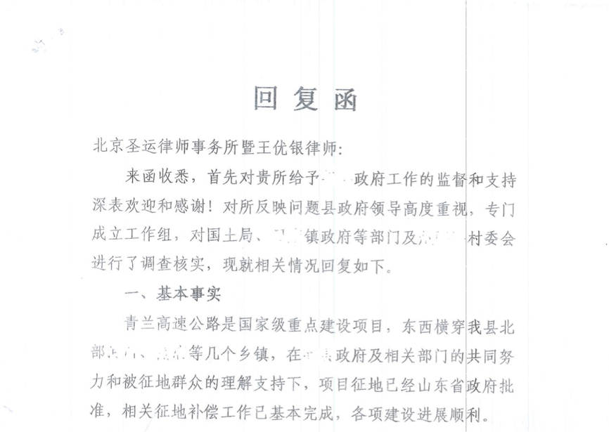 当地政府接到律师函后第一时间和圣运律师取得联系,并对律师函进行了书面回复,回复函声称,本次征地已经由山东省政府予以批准,相关征地补偿工作已基本完成,各项建设进展顺利。调查取证,本次征收并没取得政府批文
