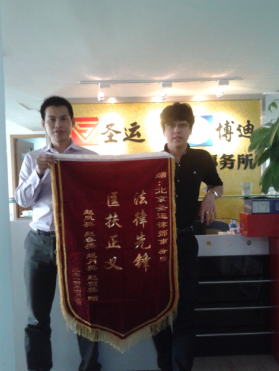【本网讯】2014年4月16日,我所当事人陈女士拆迁案获得最终胜诉,特向我所及案件代理律师尹利兵、李小乐赠送"法律先锋,医扶正义"锦旗,表示感谢。