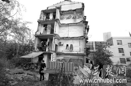 楚天金报讯 (记者饶纯武、李光正 实习生宋云鹏)汉口一栋拆掉一半的楼房,半空中悬着预制板,走道和阳台无护栏,然而里面仍有多家住户。社区负责人称,这些住户都是租客,部分房屋的出租方为大楼的拆迁方。