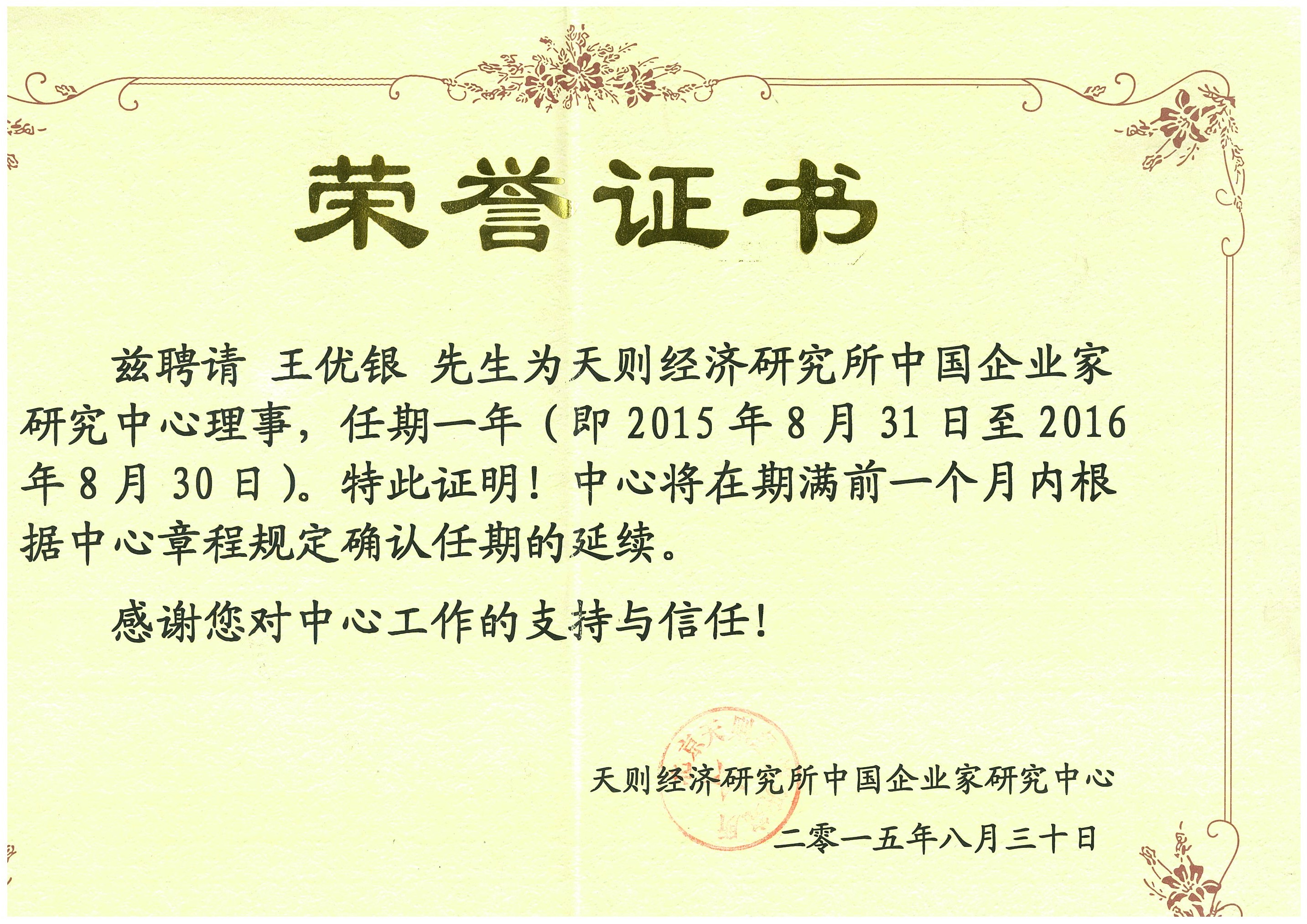 北京圣运律师事务所王有银主任受聘为天则经济研究所中国企业家研究中心理事