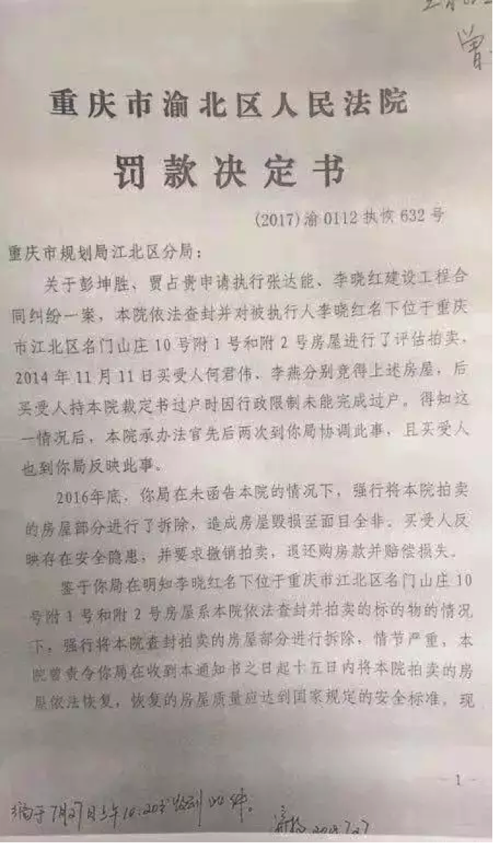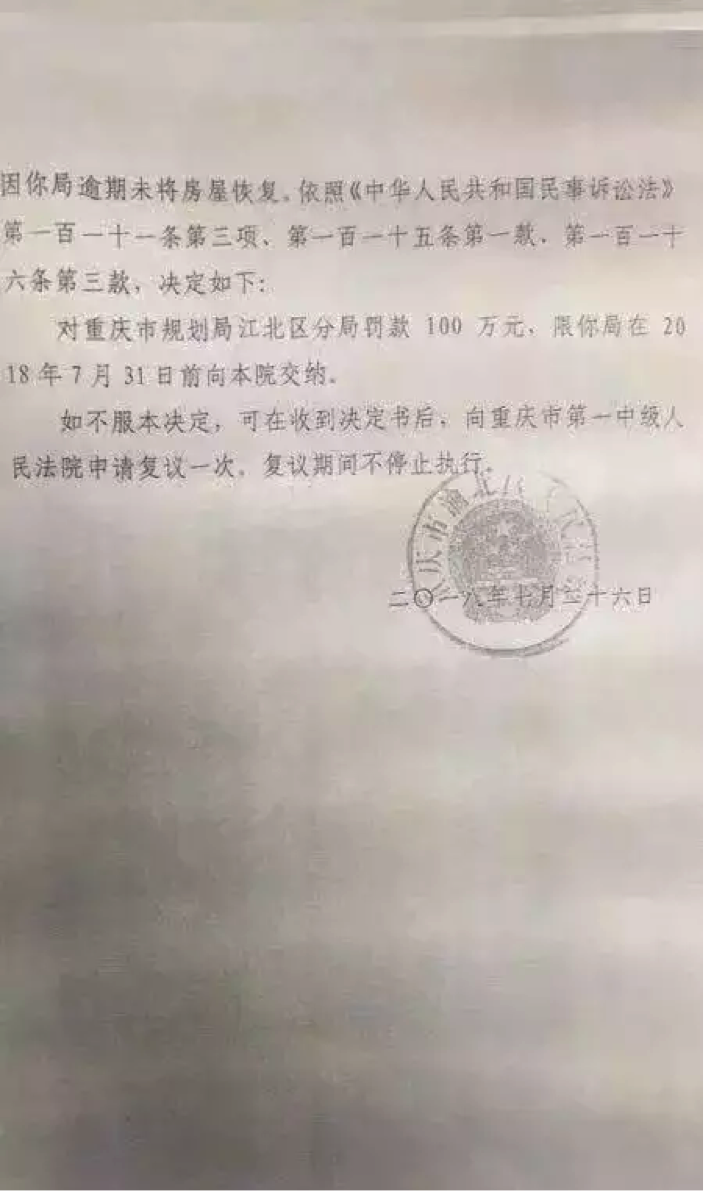 原来,重庆市规划局江北分局因强行将法院查封拍卖的房屋部分拆除,而后并未在法院责令期内将房屋复原,结果被重庆市渝北区人民法院于2018年7月26日开出罚款决定书——罚款100万元,限7月31日前向法院交纳。