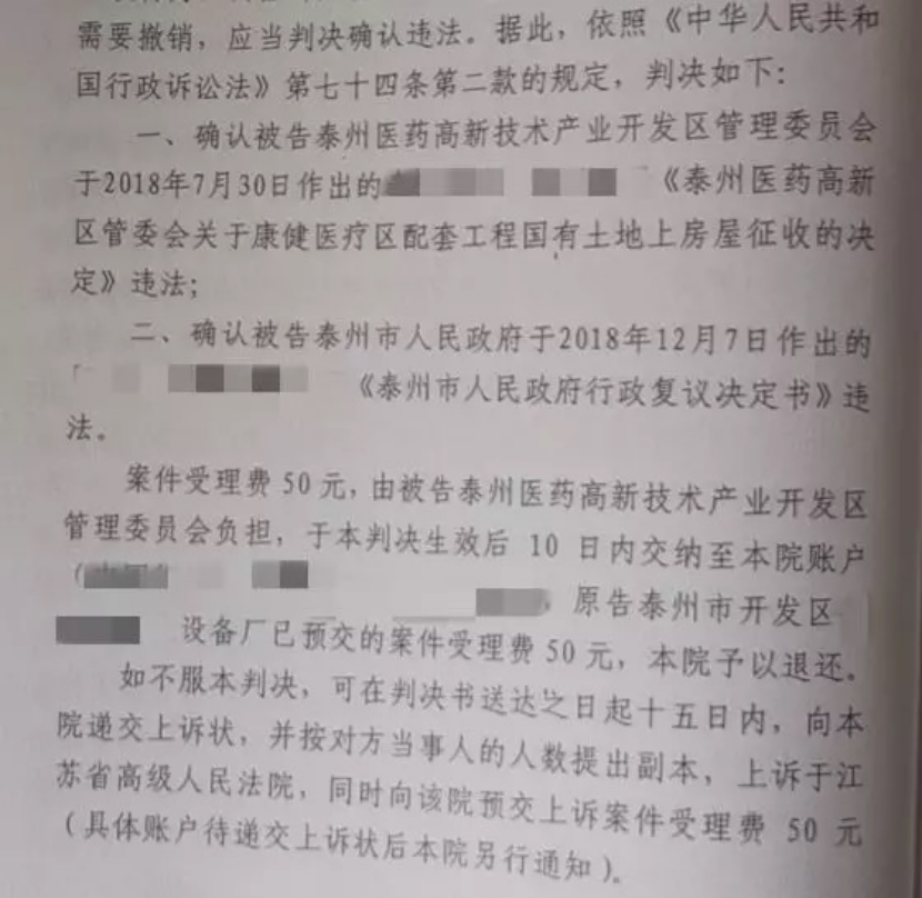 法院在查明案情后,认可了圣运律师的意见,判决确认了高新技术产业开发区管理委员会作出的征收决定违法,也确认了泰州市人民政府作出的复议决定违法。![]()