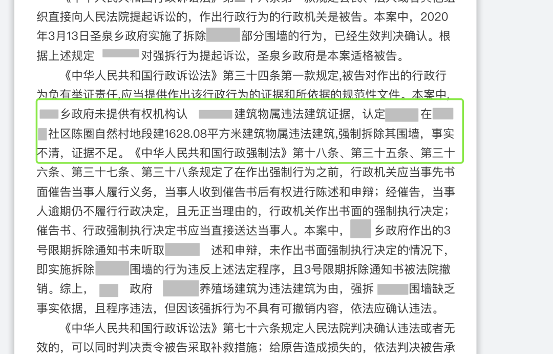 在圣运律师代理的诸多案件中,不少助力拆迁户获得胜诉都是因为征收方无法"自证清白",以下述判决书为例,拆除部门以违建名义实施强制拆除行为,需要在庭审中提交证据证明自己认定违建的行为依据,否则便是证据不足,将承担举证不能的责任。