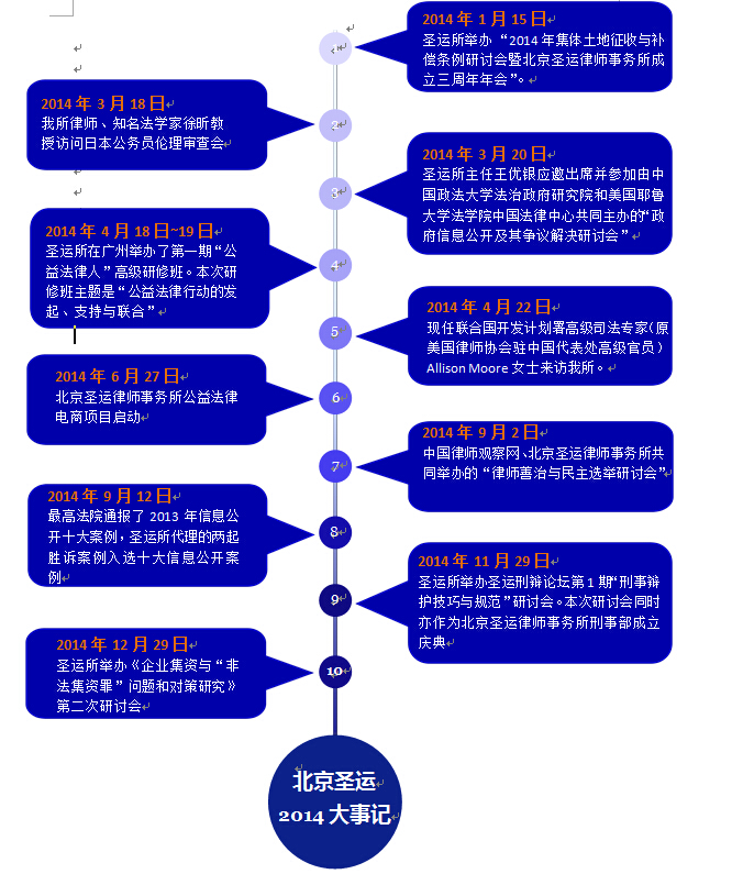 2014年1月15日,圣运所举办 "2014年集体土地征收与补偿条例研讨会暨北京圣运律师事务所成立三周年年会"。 此次研讨会共有三大议题:一、2014年十大拆迁案件的发布;二、2014年集体土地征收与补偿条例:1、集体土地上市流转;2、宅基地买卖;3、土地补偿及分配,有此引发的村民诉讼;三、北京圣运律师事务所三周年年会。