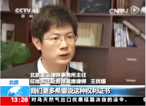 王有银 圣运律师事务所主任,北京理工大学法学院兼职教授、研究生导师,征地拆迁业务部首席大律师,近二十年法律服务经验,土地法专家、行政法实务专家。因在征地拆迁领域的突出贡献,多次被中央电视台CCTV新闻频道、CCTV财经频道、人民日报、法制日报、人民政协报、南方都市报、财新网、香港有线电视台、亚洲周刊、英国BBC电台等数百家中外媒体采访报道。《中国律师》杂志、《中国律师网》特邀评论员,《第一视频》特邀评论员,参与立法活动,为多个行政立法活动提供建议和意见。"2013年度中国十大最具影响力律师"、"2015最受媒体欢迎律师"等称号。