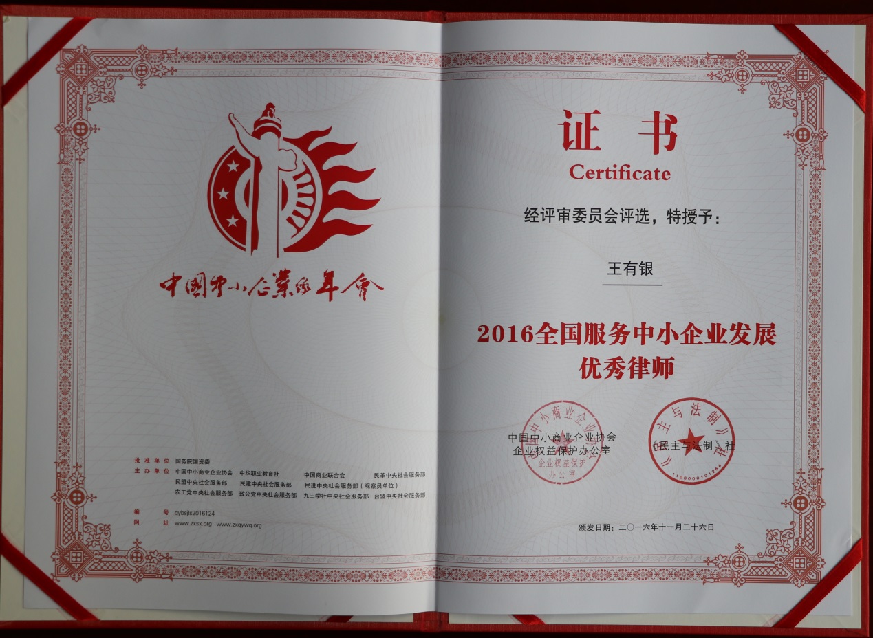 王有银律师荣获"2016全国服务中小企业发展优秀律师"荣誉称号