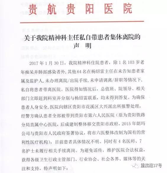 2月4日下午,贵航贵阳医院在其官网发布《关于我院精神科主任私自带患者集体离院的声明》。声明中,贵航贵阳医院称,1月30日下午,该院精神科主任杨绍雷在未告知患者家属及监护人,未办理手续,未申请离职等情况下,"私自将64名精神科住院患者带离医院"。声明中同时表示,"经过警方调查,患者全部被带到贵阳市第六人民医院(下称贵阳六院),目前患者具体情况不明。"