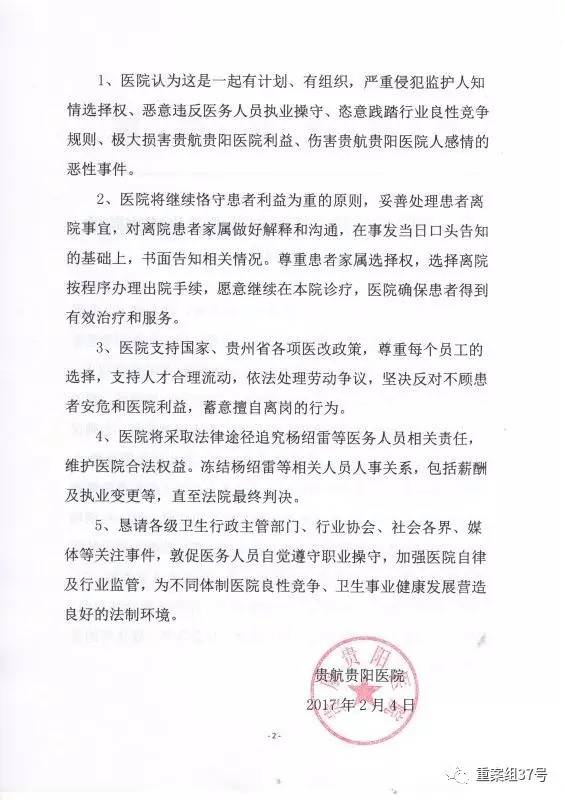 贵航贵阳医院表示,该院同时有4名医师、7名护士未履行相关手续离岗。上述医院将该起事件,定义为一起"有计划、有组织,严重侵犯监护人知情选择权、恶意违反医务人员执业操守、恣意践踏行业良性竞争规则……的恶性事件"。