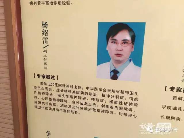 公开资料显示,杨绍雷职称为副主任医师,毕业于贵阳医学院临床医学系,系中华医学会贵州省精神卫生委员会委员,擅长精神科疾病的诊疗。