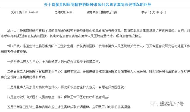 ▲贵阳市卫计委关于贵航贵阳医院精神科医师带领64名患者离院有关情况的回应。 网络截图