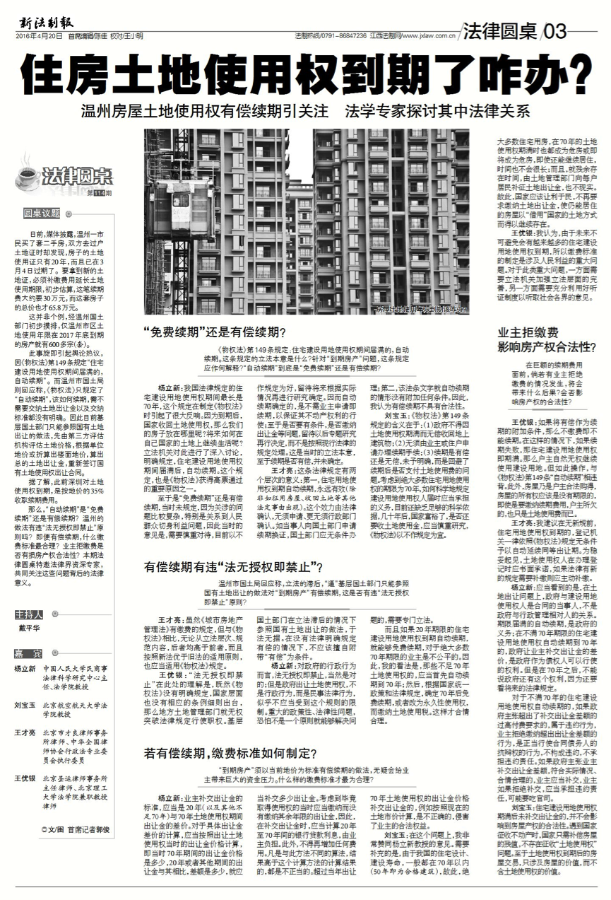 那么,"自动续期"是"免费续期"还是有偿续期?温州的做法有违"法无授权即禁止"原则吗?即便有偿续期,什么缴费标准最合理?业主拒缴费是否有损房产权合法性?本期法律圆桌特邀法律界资深专家,共同关注这些问题背后的法律意义。