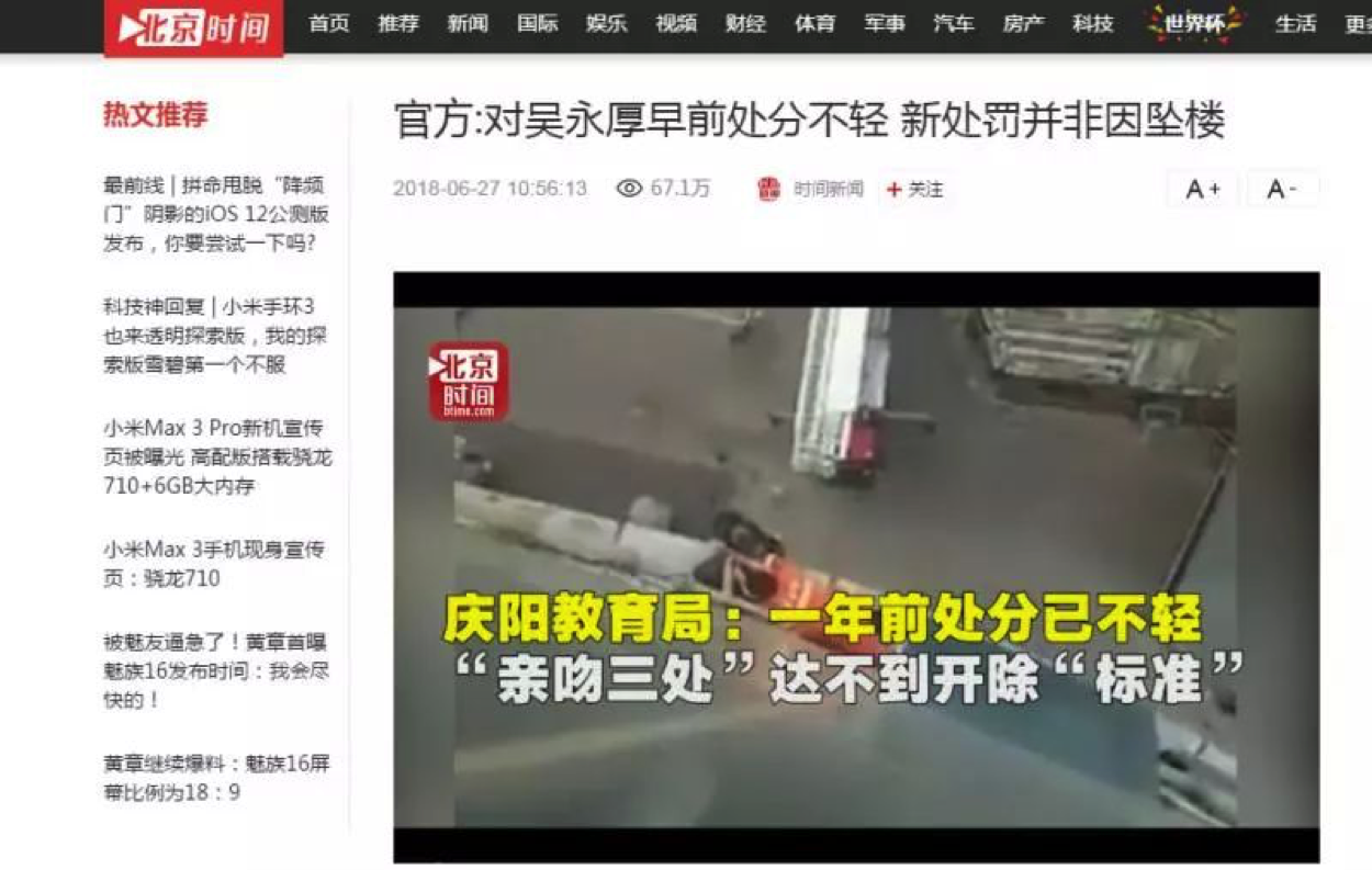 26日,北京时间@时间新闻 首次从庆阳市教育局得到回应,2017年7月的"行政降级,调离岗位"处分,系将吴某由高三教师改任教辅人员。教育局工作人员解释,根据警方认定构成猥亵的情节及相关法规,"亲吻三处"的情节比较严重,但是达不到把这个老师开除的程度。2017年5月,吴某被行政拘留10日,警方行政处罚决定书中提到,其用嘴在李某奕额头、脸部、嘴部等部位亲吻,整个过程约三分钟。