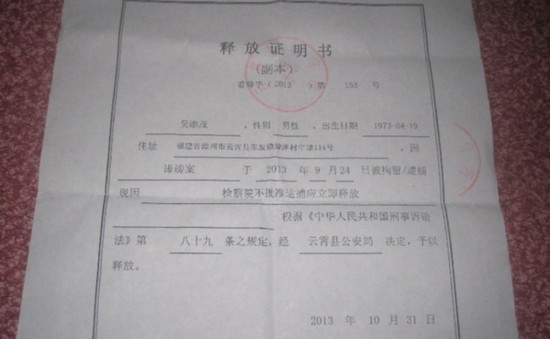 在众多网友的关注下,2013年10月31日,云霄县公安局向吴添茂出具了《释放证明书》,称"吴添茂因诽谤案于2013年9月24日被拘留,现因检察院不批准逮捕应立即释放。"至此,在被关押30多天后,吴重获自由。