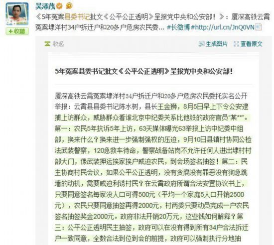 由于吴添茂有文化,敢仗义执言,被众拆迁户推选为代表。2013年7月起,吴添茂一方面向纪委等部门反映埭洋村民多年得不到安置的问题,另一方面也开始利用腾讯微博进行实名举报。因为上访,他在云霄当地小有名气,也因此被有关部门"格外"照顾。