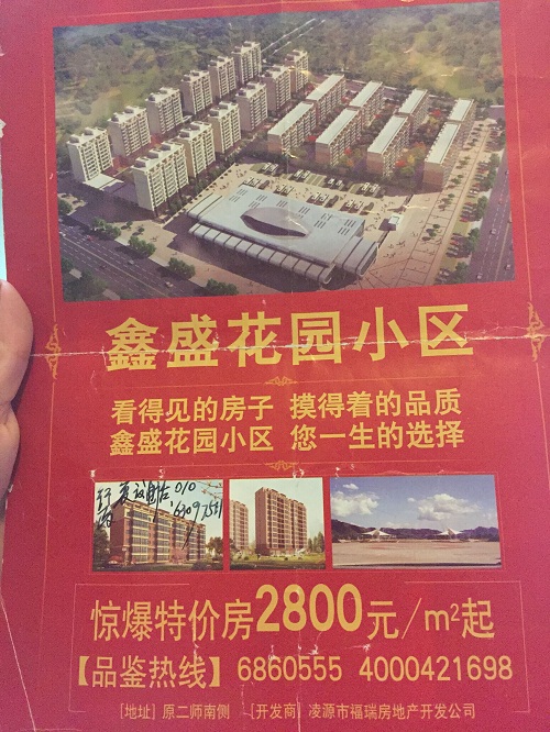 与此同时,多个事实证明,河南组地块开发并不是公益性质项目,而是赢利性质的商品房开发项目。在被强征地块的外围入口处,一个名为"鑫盛花园小区"的商品房项目大幅广告已魏然屹立。在该项目的广告宣传页中"惊爆特价房2800元一平米"的广告赫然在目,广告页的右下角注明该项目的开发商为凌源市福瑞房地产开发公司。多位村民申请信息公开后发现,该"鑫盛花园小区"项目既没有凌源市发改委的立项也没有规划局的规划。