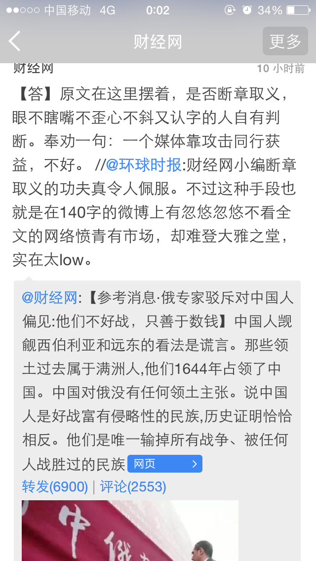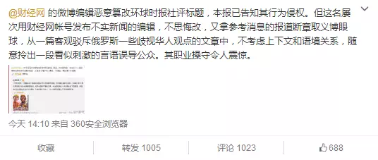 昨天,财经网和环球时报在微博上掀起了一场论战。起因在于财经网在微博上转载了一篇《参考消息》的文章,环球时报认为财经网"断章取义、篡改标题",遂转发微博并反击。话不多说,上图先睹为快。