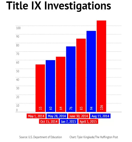 上图为美国教育部民权办公室OCR对性侵和和性暴力行为处理措施有所争议或处理不当的大学进行调查,这项调查被称为1972年教育法修正案第九条调查(Title IX Investigations)。OCR在2014年5月第一次公布该名单的时候,约有55所大学名列其中。而时隔不到一年,此名单上学校的数量居然翻了一番。