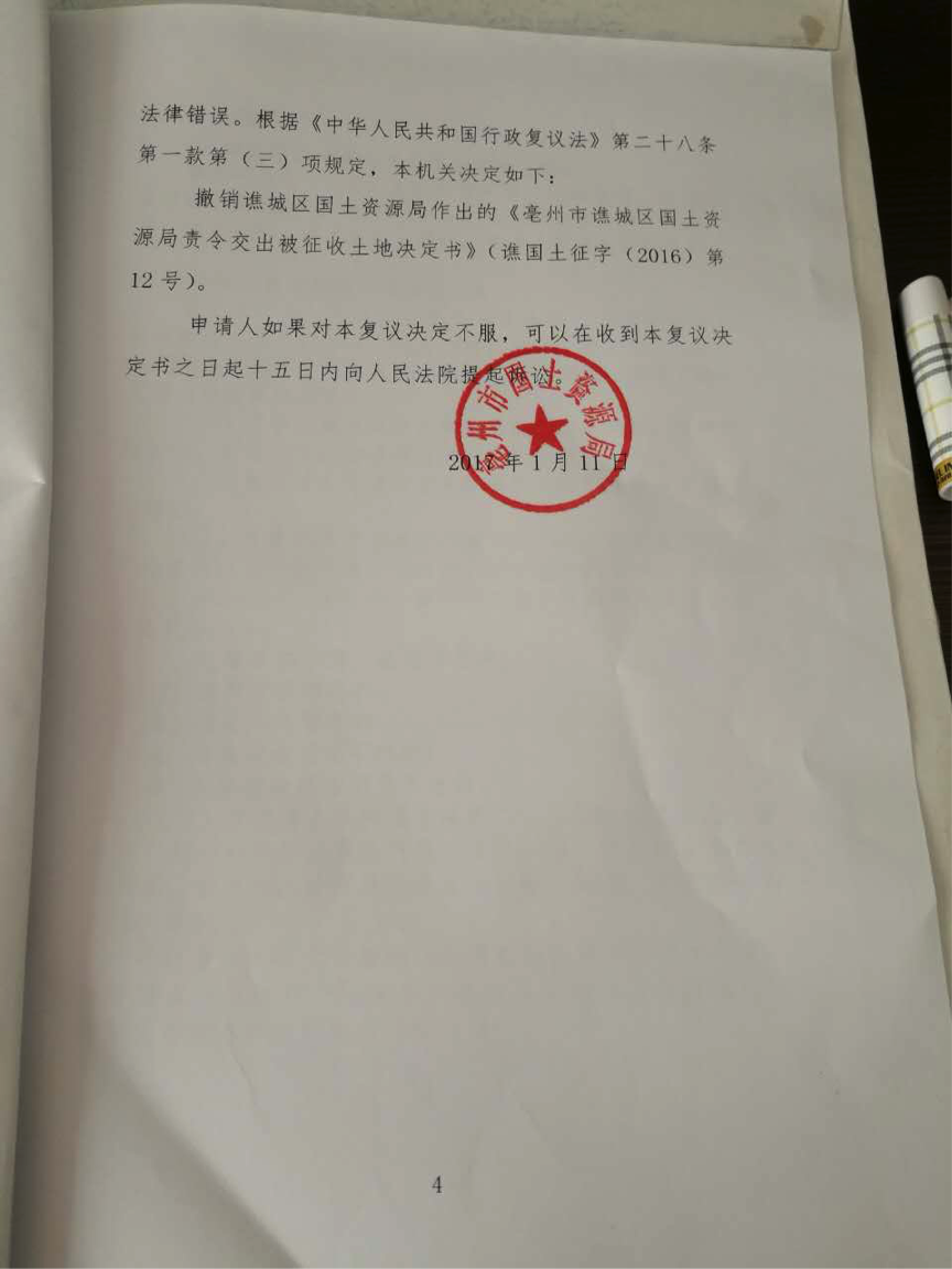 亳州市国土资源局迅速受理了该案件,很快谯城区国土资源局便进行了答辩,在其答辩意见中指出尽管靳先生拥有国有土地使用权证但仍不能证实其土地系国有土地,此答复意见被亳州市国土资源局全盘否认,最终亳州市国土资源局于2017年1月11日作出决定,依法撤销谯城区国土资源局作出的《责令交出被征收土地决定书》,就在收到该决定书前2天,靳先生还在担心自己房屋会面临强拆的可能,圣运律师和靳先生收到此决定书都松了一口气,靳先生可以过一个安稳年。年后,圣运律师还将对靳先生的征地案件中其他的违法性进一步进行打击,力争为靳先生拿到满意的补偿。